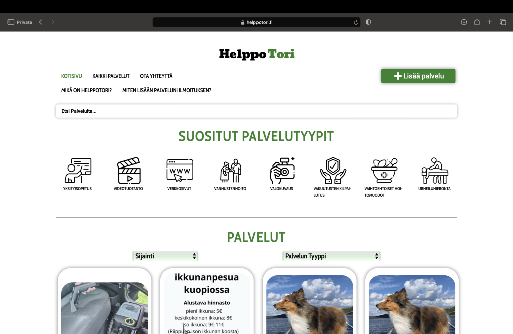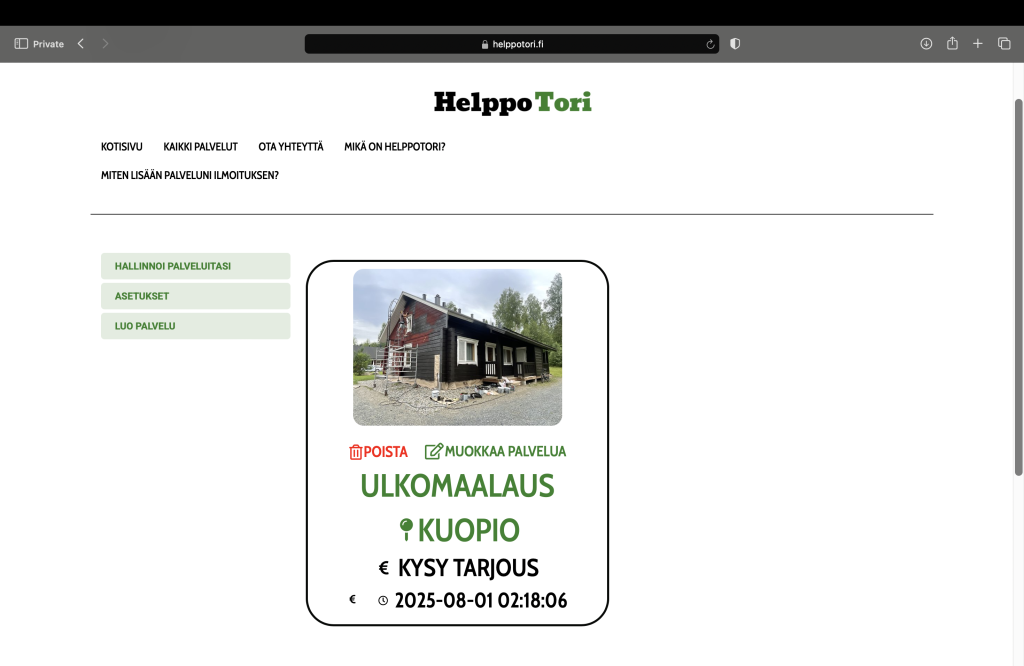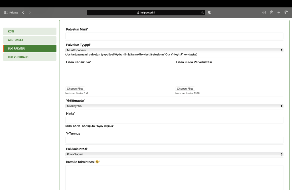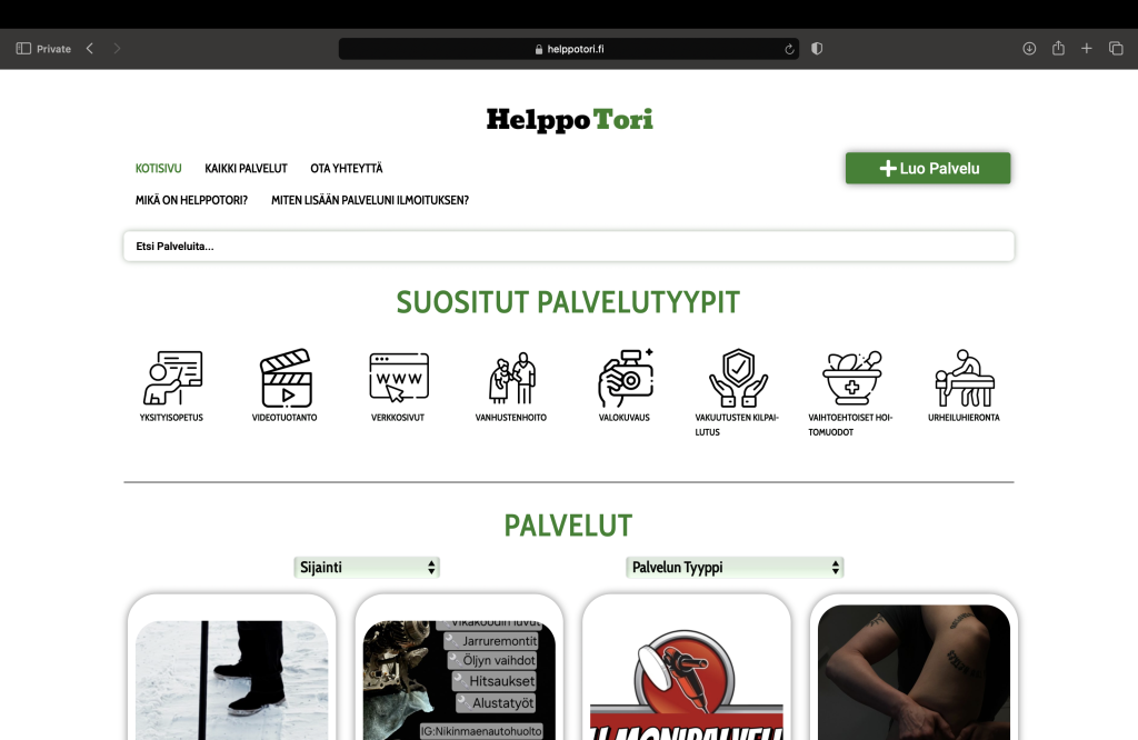 Lisää palvelu Lisää palvelu Kotisivu Kaikki palvelut Ota Yhteyttä Mikä on HelppoTori? Miten lisään palveluni ilmoituksen? Miten lisään palveluni ilmoituksen HelppoToriin? 1. Pääset rekisteröitymään oikean (puhelimella vasen) yläkulman "Lisää palvelu"- napista. 2. Rekisteröitymisen/Kirjautumisen jälkeen pääset profiilisivulle oikean (puhelimella vasen) yläkulman "Luo Palvelu"- napista. 3. Palvelusi ilmoituksen pääset luomaan painamalla vasemman reunan "LUO PALVELU"- kohtaa. 4. Ilmoituksen lisäämisen jälkeen löydät ilmoituksen "Hallinnoi palveluitasi"-sivulta. Voit muokata ilmoitustasi painamalla "Muokkaa Palvelua"- kohdasta tai poistaa ilmoituksen "Poista"- napista. Kaikki palvelut yhdessä paikassa - HelppoTori Sivut Kotisivu Kaikki palvelut Ota Yhteyttä Mikä on HelppoTori? Miten lisään palveluni ilmoituksen? Kotisivu Kaikki palvelut Ota Yhteyttä Mikä on HelppoTori? Miten lisään palveluni ilmoituksen? Facebook-f Tietosuojaseloste Käyttöehdot